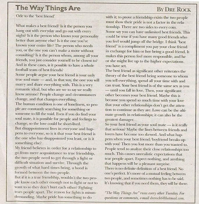 I was reading my school newspaper and came upon this and just found it interesting. Kind of made me think about friends and how to value friendship. I've been through my share of friendships and lost one of my best friends over something stupid. But it's also weird how the people you don't expect to be there for you at times are the ones who come to your aid. I admit I'm not one to make friends easily, it takes awhile for me to gain there trust, but once its there I'll stick by your side.